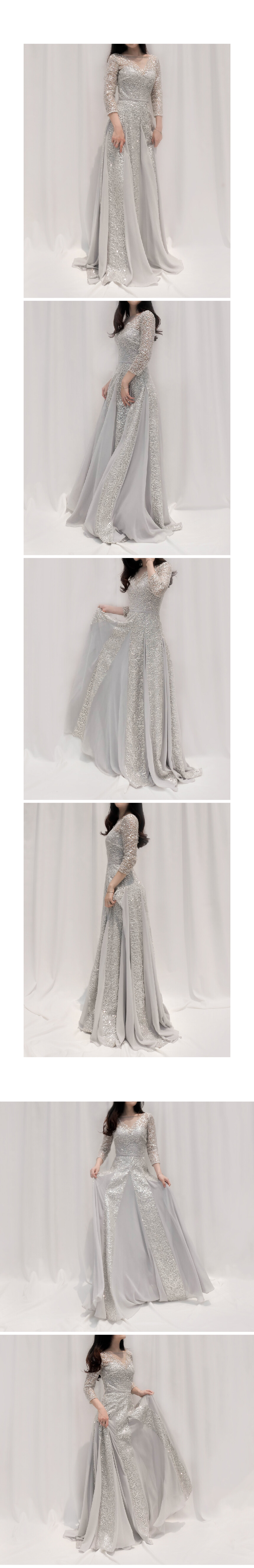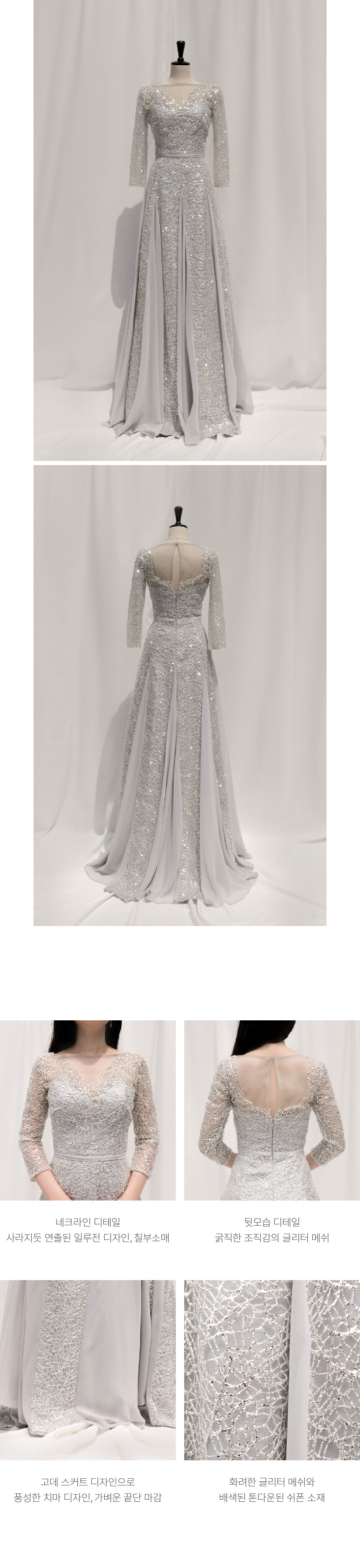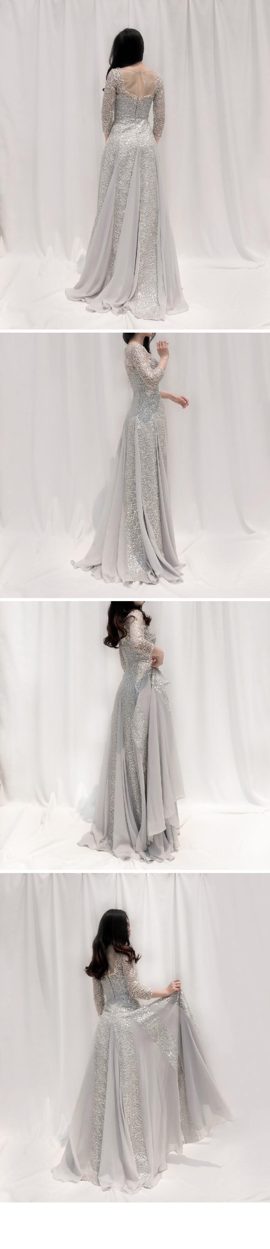 굵직한 조직감의 글리터 메쉬 소재 일루전 네크라인 실버 드레스 by Terani Couture