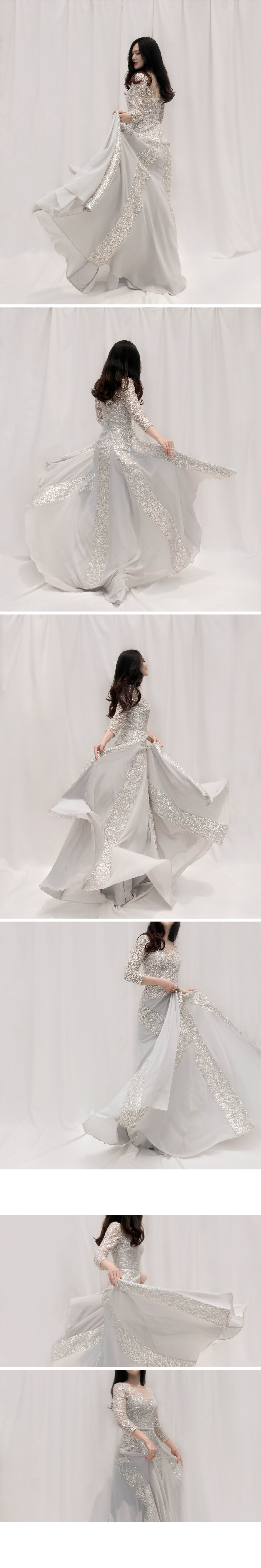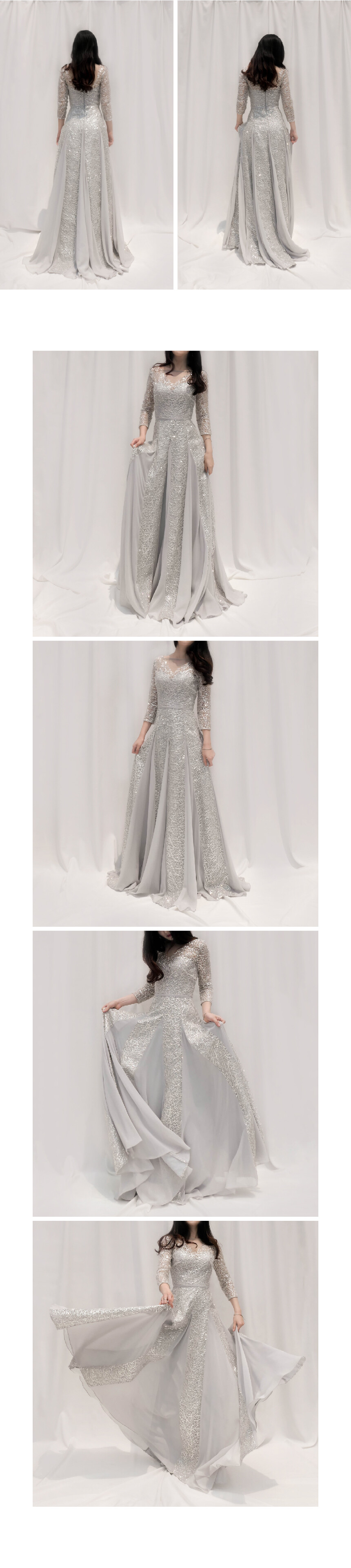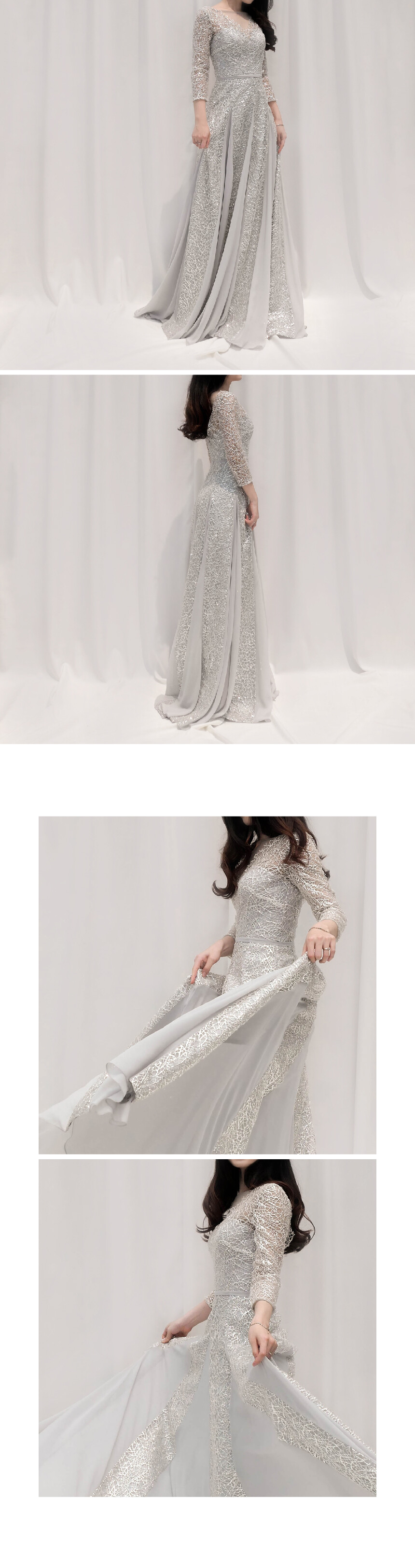 굵직한 조직감의 글리터 메쉬 소재 일루전 네크라인 실버 드레스 by Terani Couture