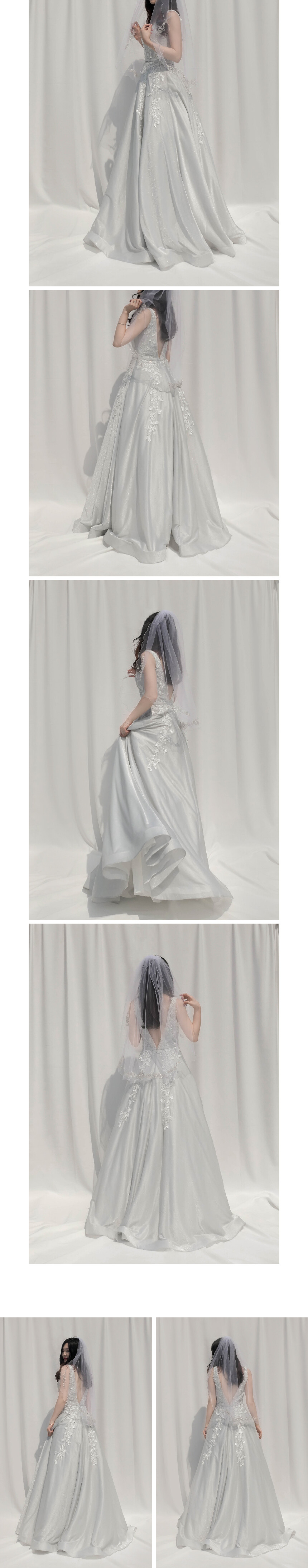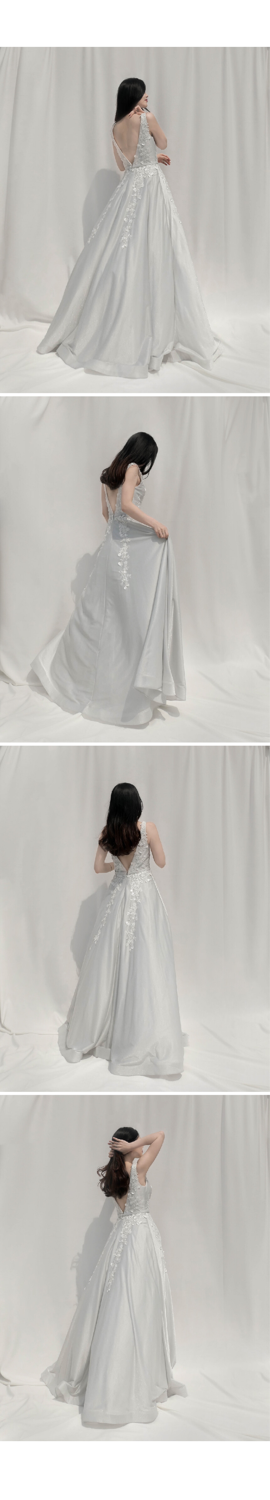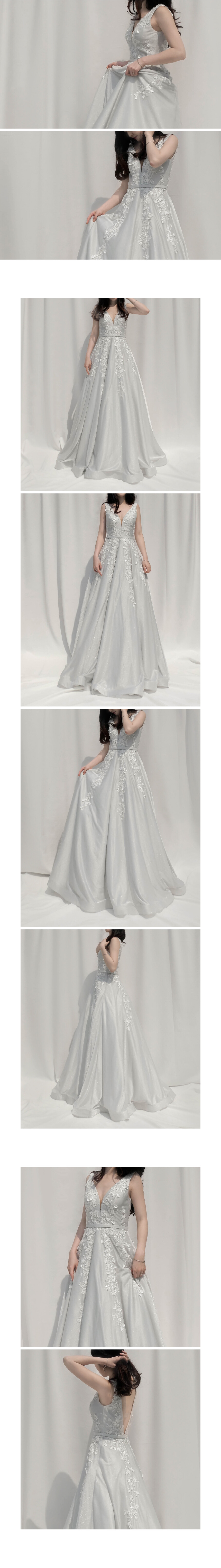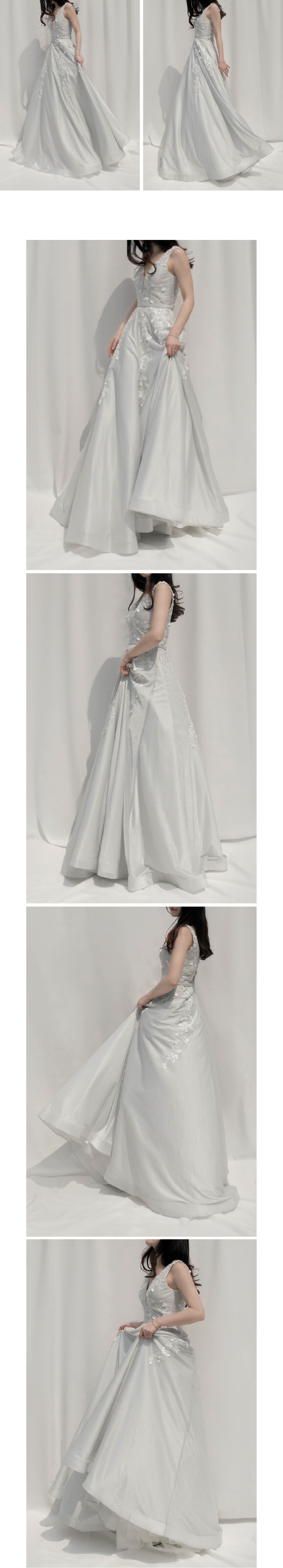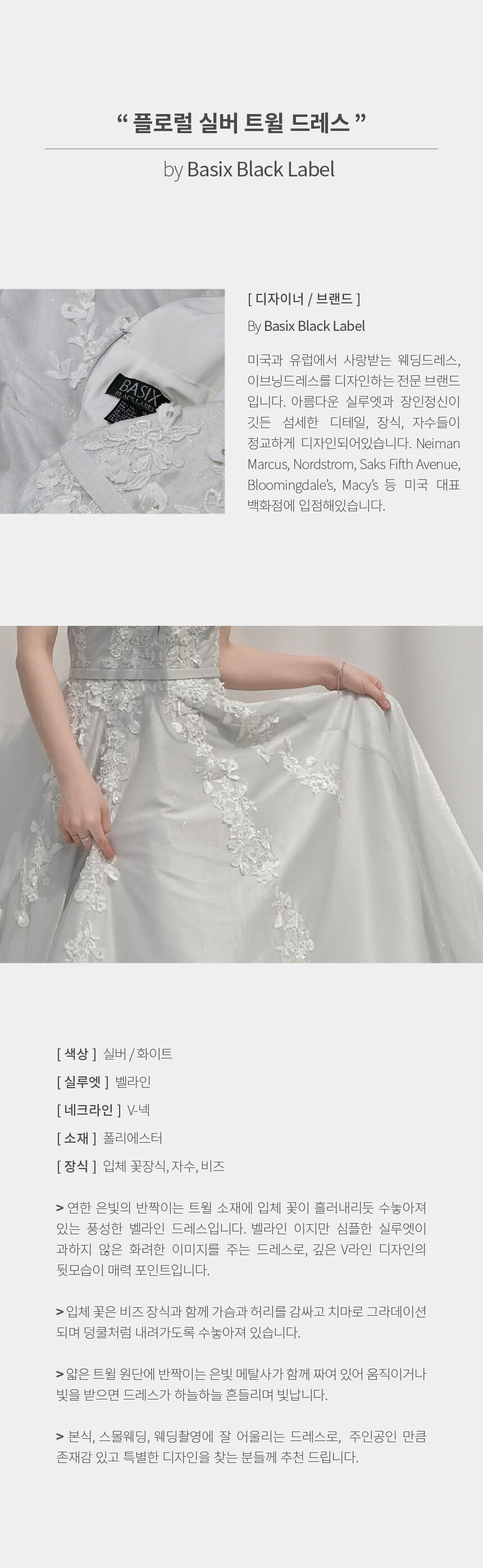 연한 은빛의 반짝이는 트윌 원단에 입체 꽃이 플러내리듯 수놓아져있는 풍성한 벨라인 드레스 by Basix Black Label