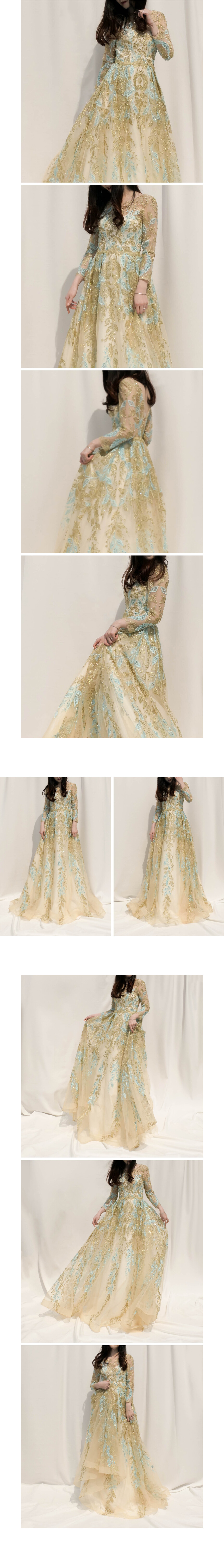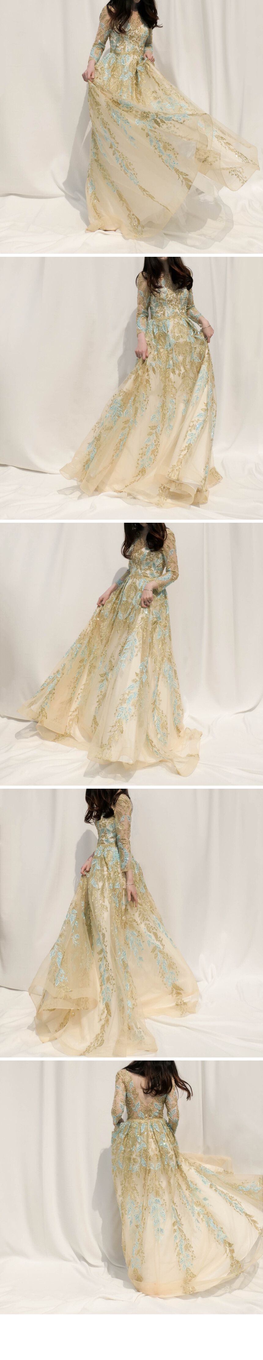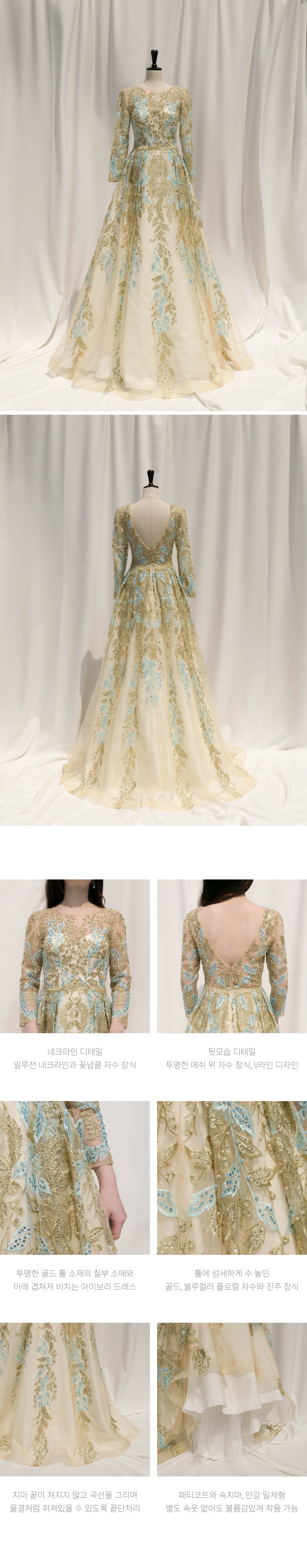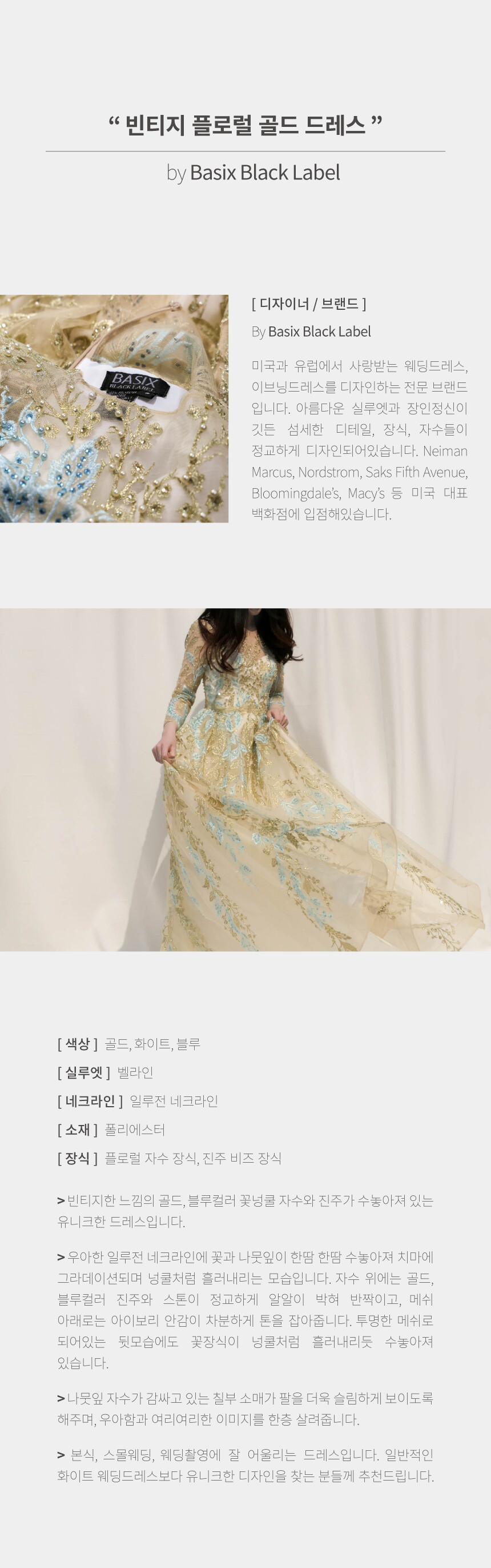 빈티지한 느낌의 골드, 블루컬러 꽃넝쿨 자수와 진주가 수놓아져 있는 유니크한 드레스 by Basix Black Label