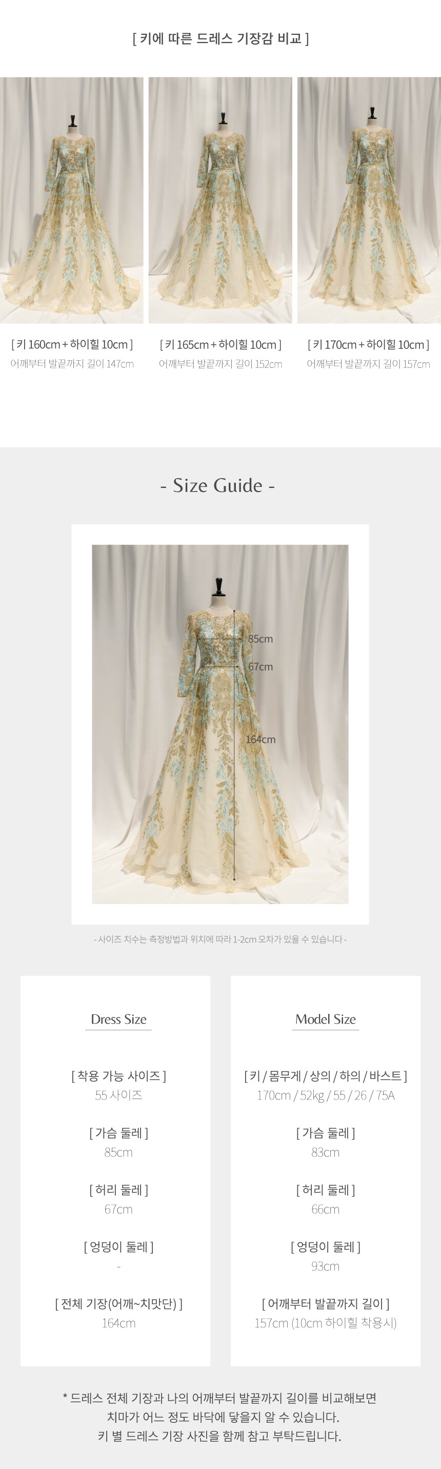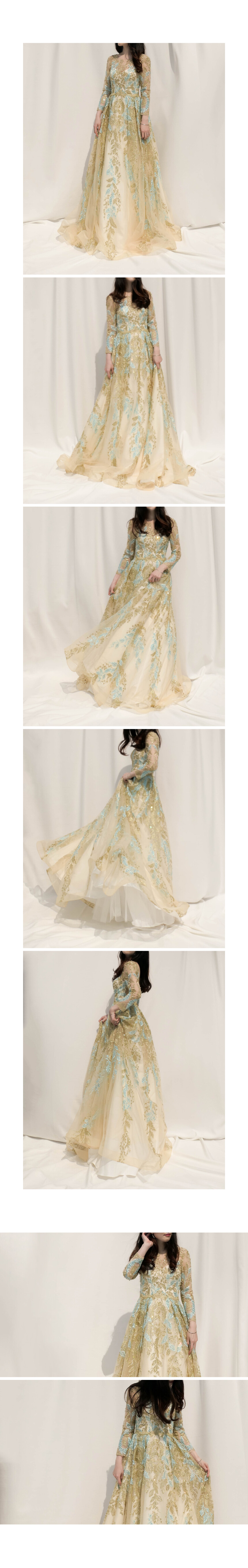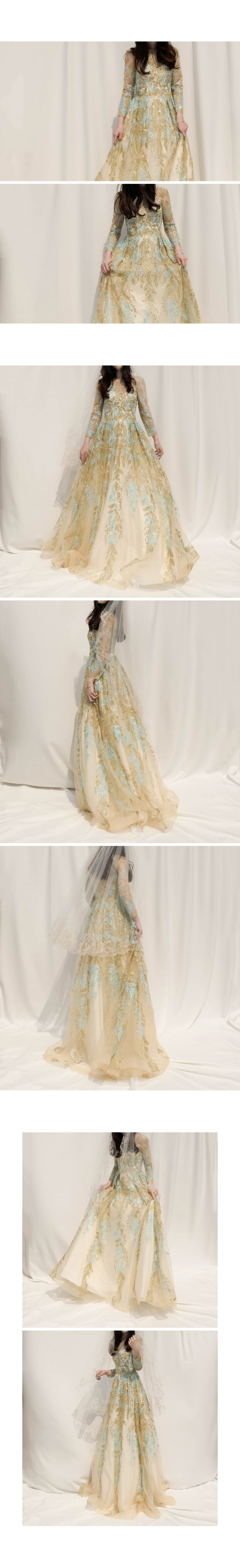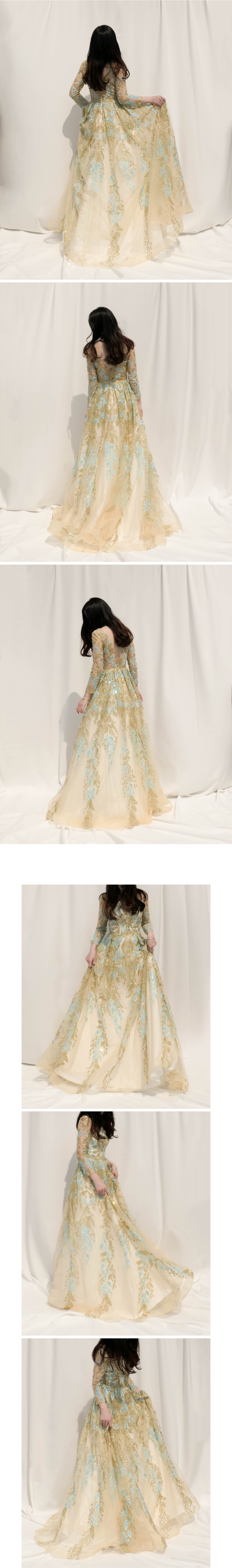 빈티지한 느낌의 골드, 블루컬러 꽃넝쿨 자수와 진주가 수놓아져 있는 유니크한 드레스 by Basix Black Label