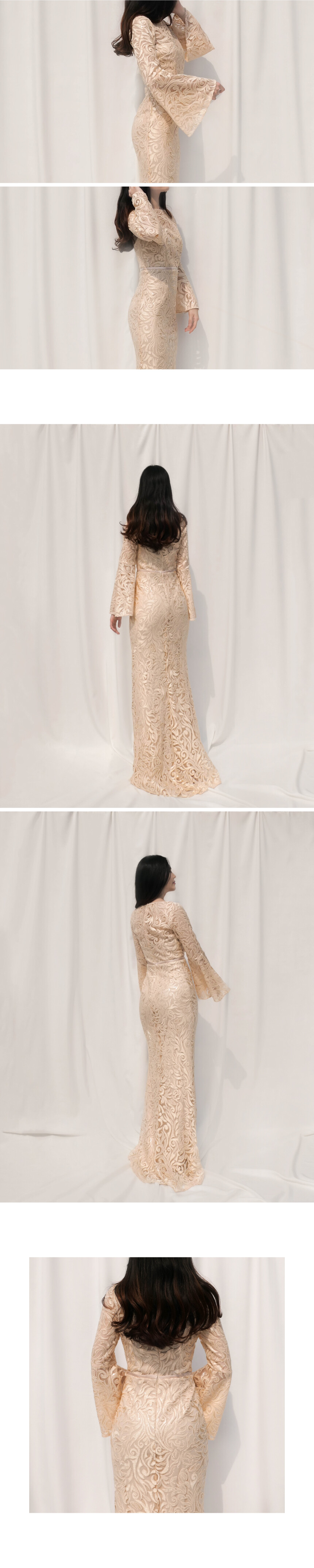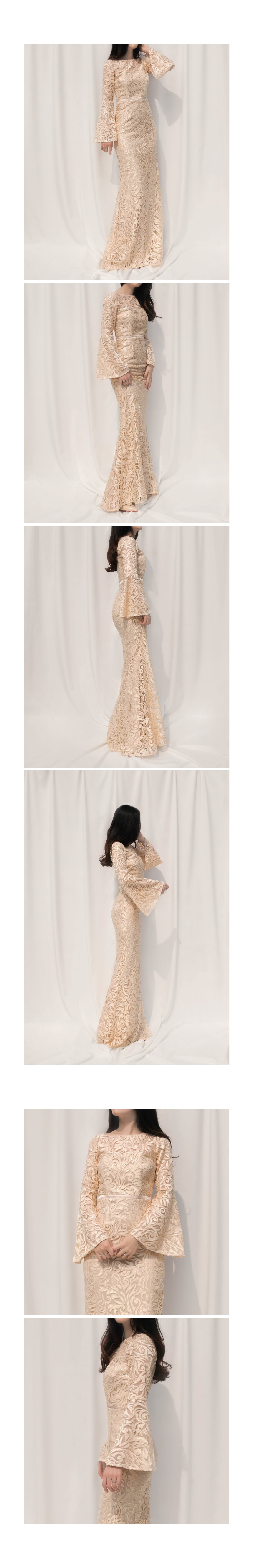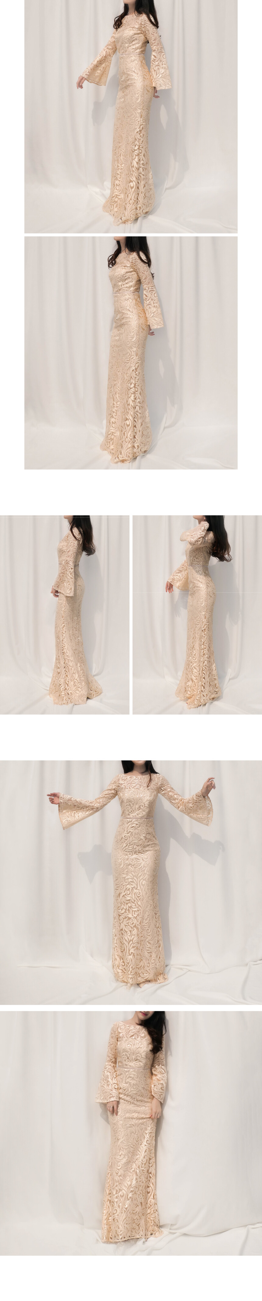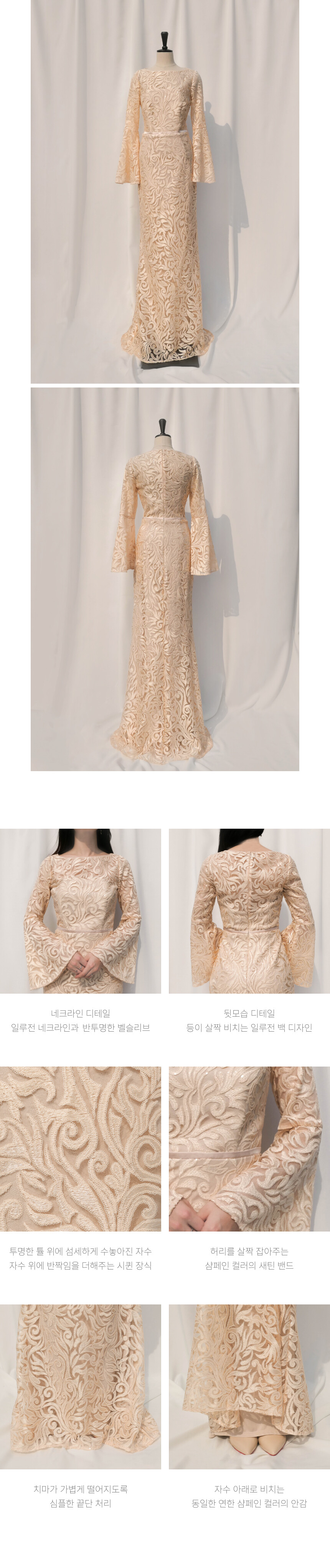 샴페인 컬러 자수가 드레스 전체에 수놓아진 벨슬리브 머메이드 드레스 by Laundry by Carmen Marc Valvo Infusion