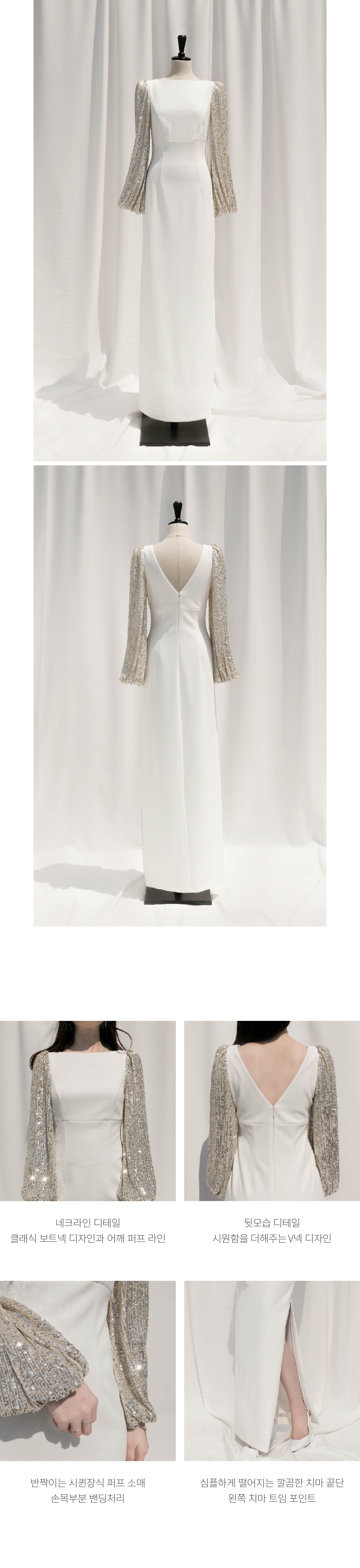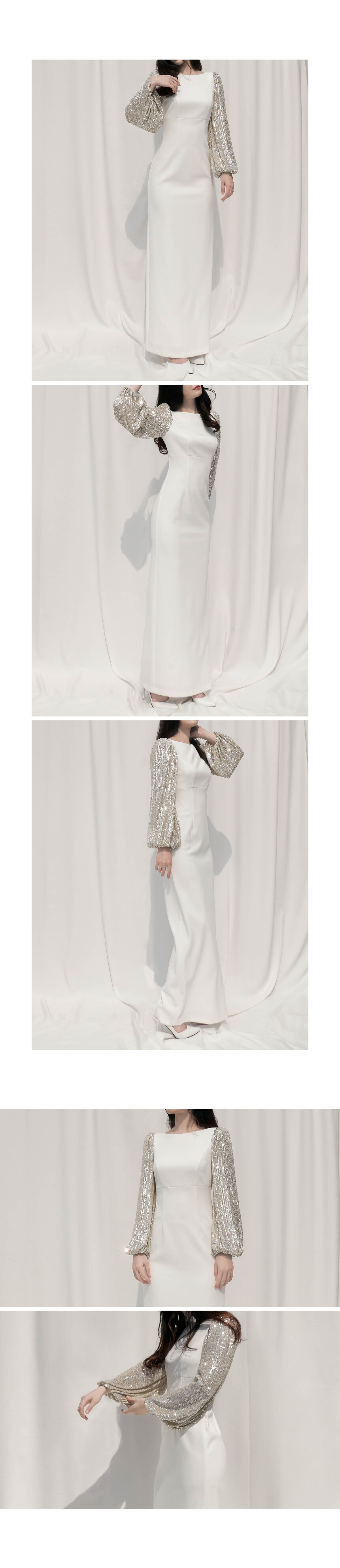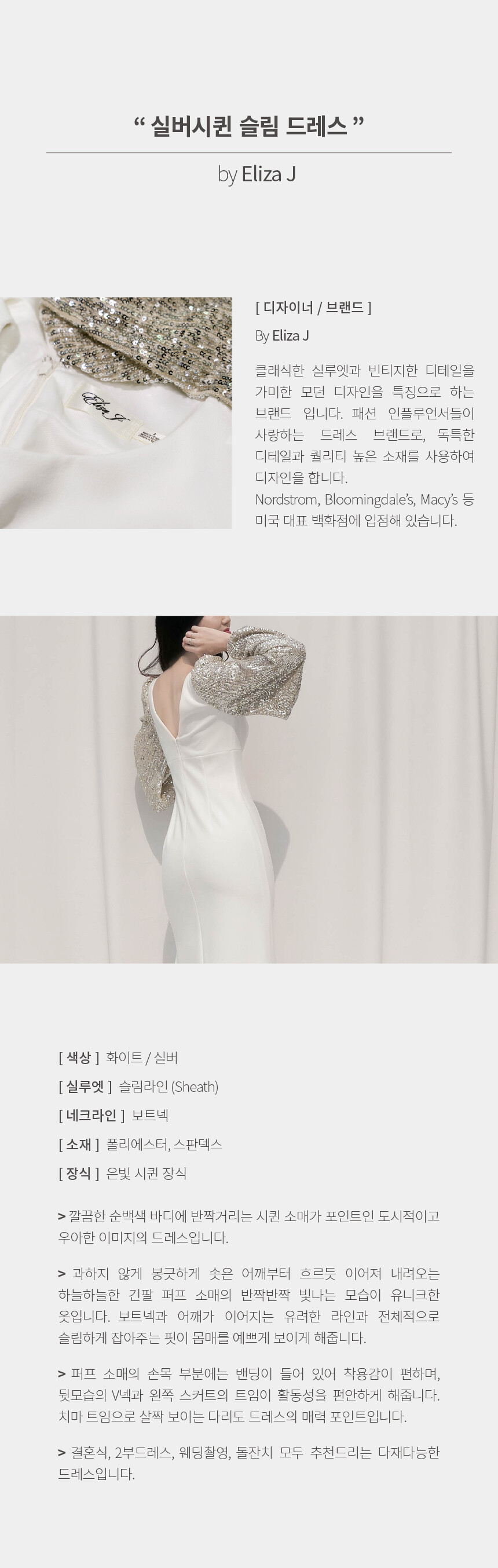 심플한 보트넥 슬림 드레스에 반짝이는 실버 시퀸 퍼프 소매가 더해진 도시적이고 모던한 이미지의 드레스 by Eliza J