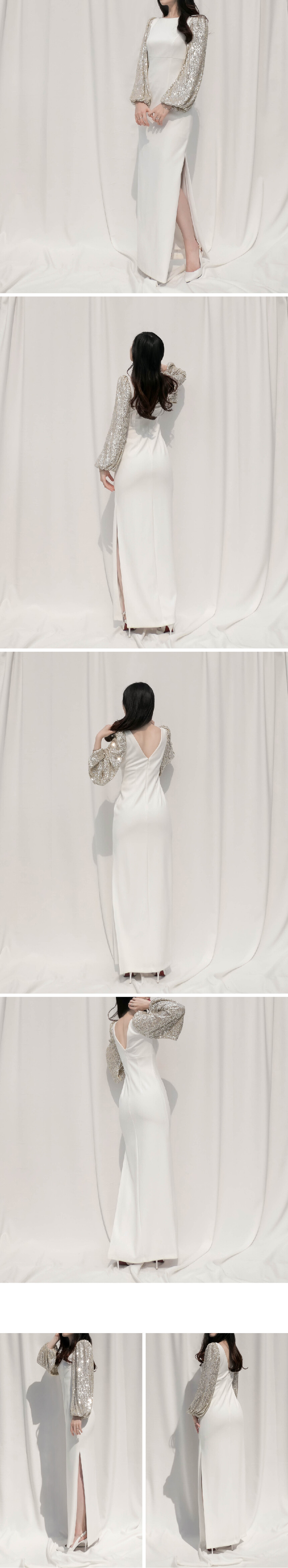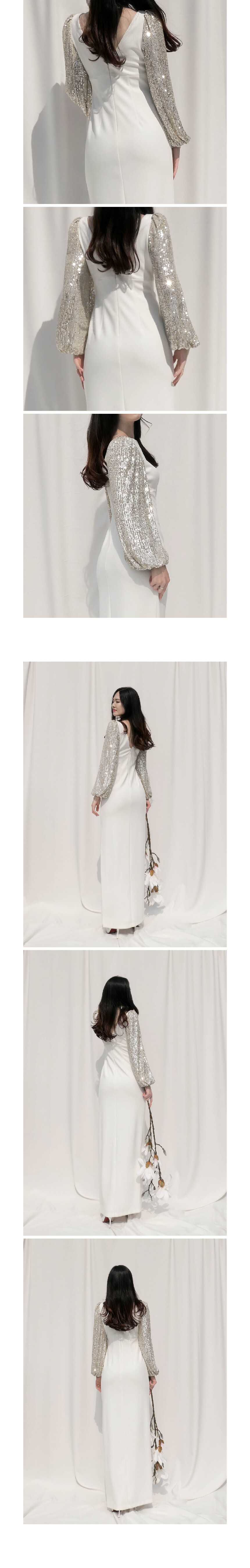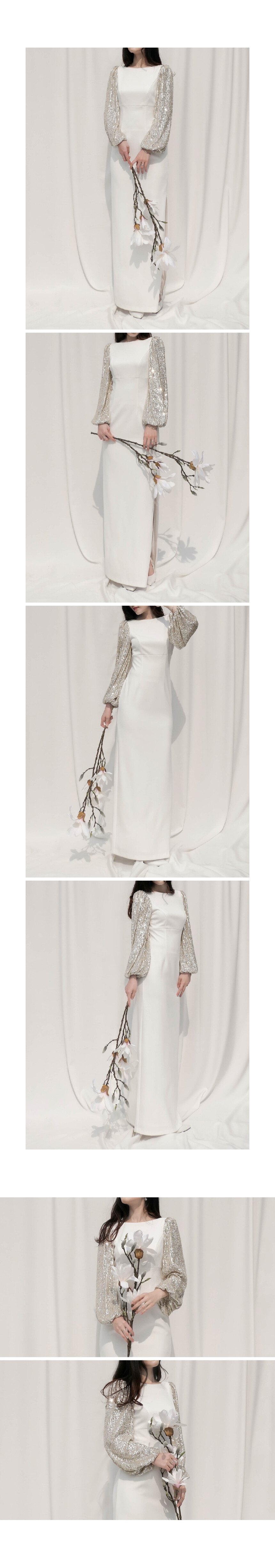 심플한 보트넥 슬림 드레스에 반짝이는 실버 시퀸 퍼프 소매가 더해진 도시적이고 모던한 이미지의 드레스 by Eliza J