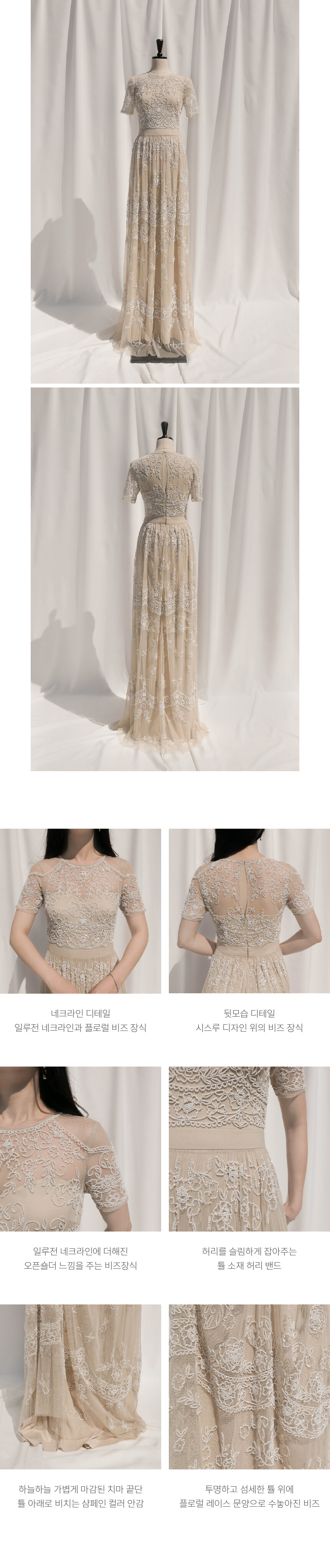 샴페인 컬러 튤 원단에 플로럴 레이스 무늬로 비즈가 정교하게 수놓아져 있는 드레스 by Bhldn