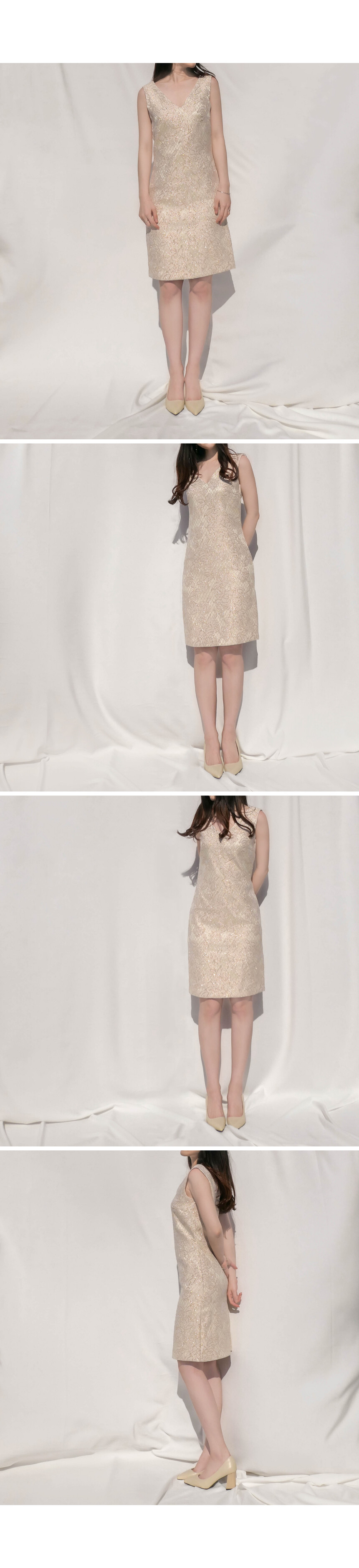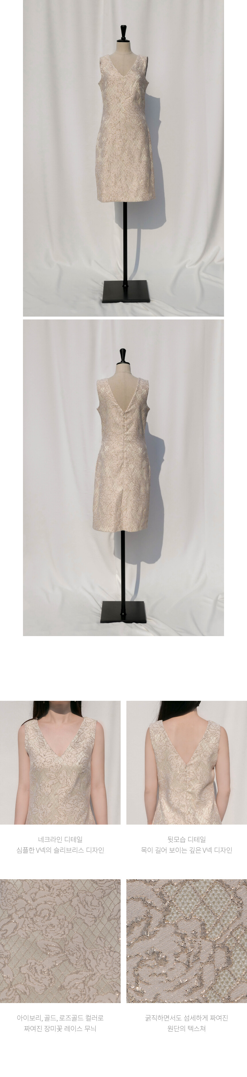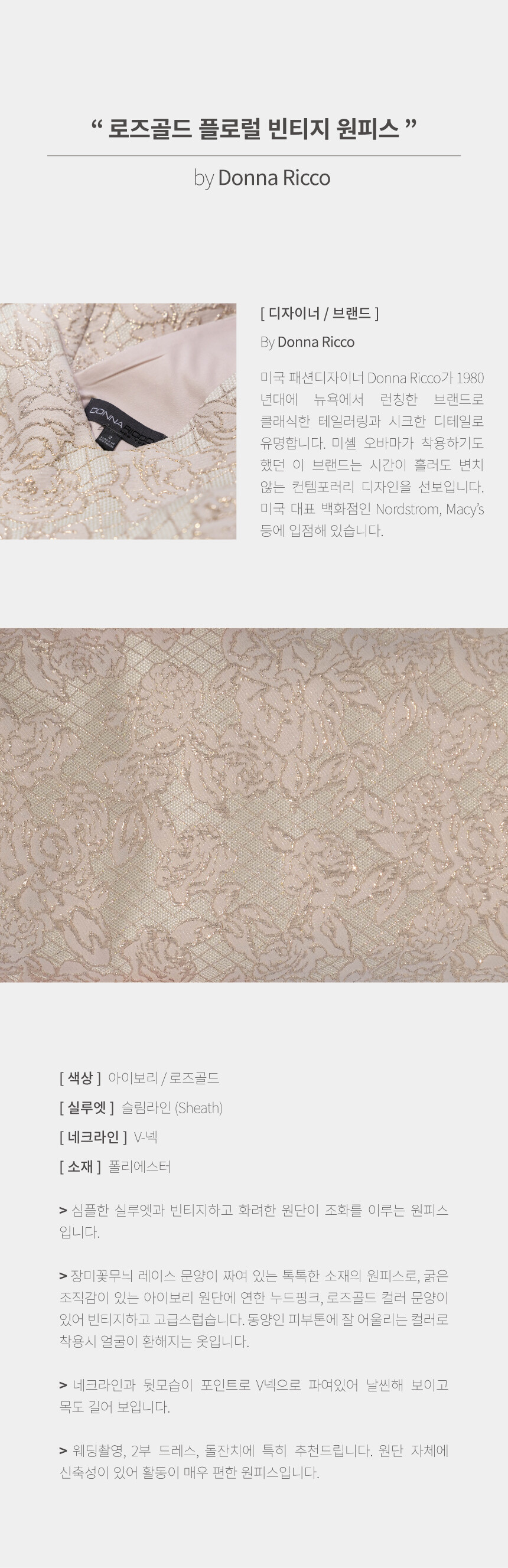 장미꽃 레이스 문양이 짜여 있는 유니크한 소재의 로즈골드 컬러 원피스 by Donna Ricco