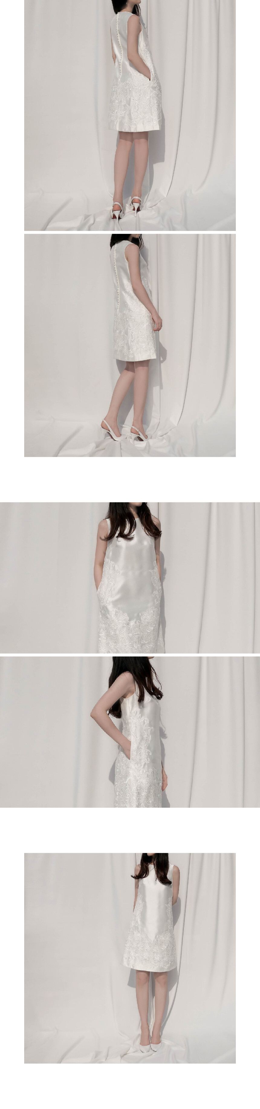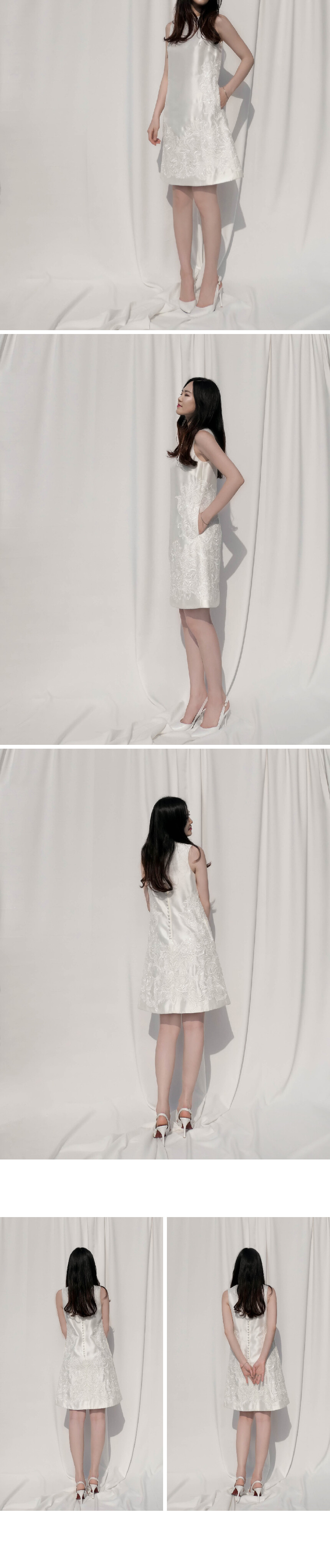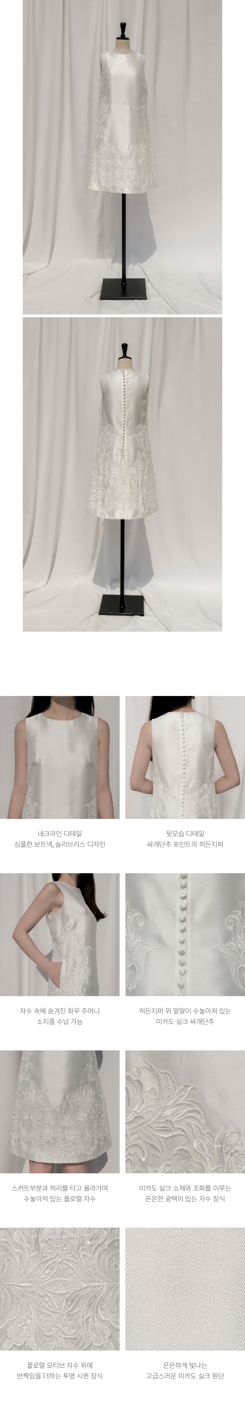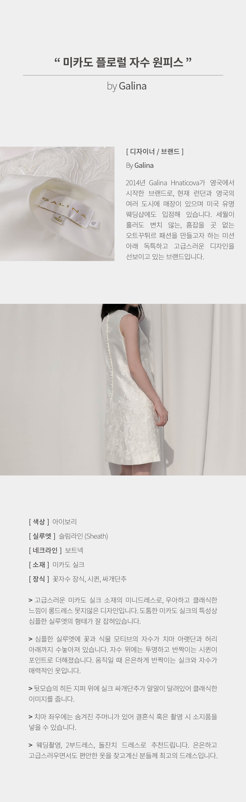 심플한 실루엣의 은은하게 빛나는 미카도 새틴 원단에 플로럴 자수가 수놓아진 원피스 by Galina